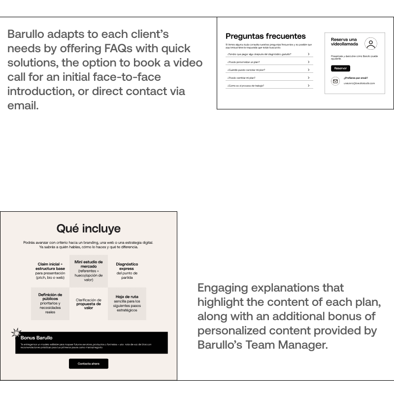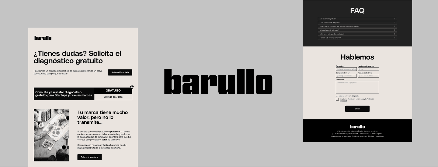 A clear design and structure were defined for the Home and Landing pages, aligned with Barullo’s bold and outspoken character, as well as a close, disruptive, and creative style.