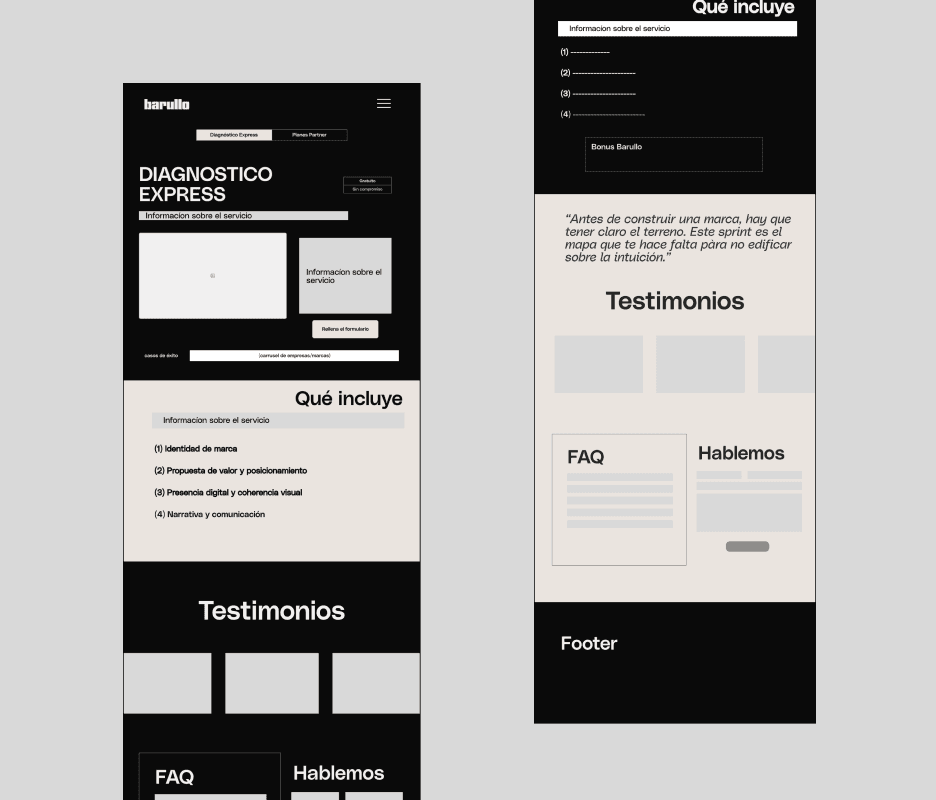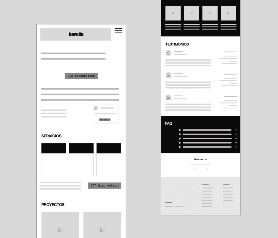 Initially, we organized the information architecture by defining several essential sections for Barullo’s new website, such as completed projects, client testimonials, a blog, and FAQs.