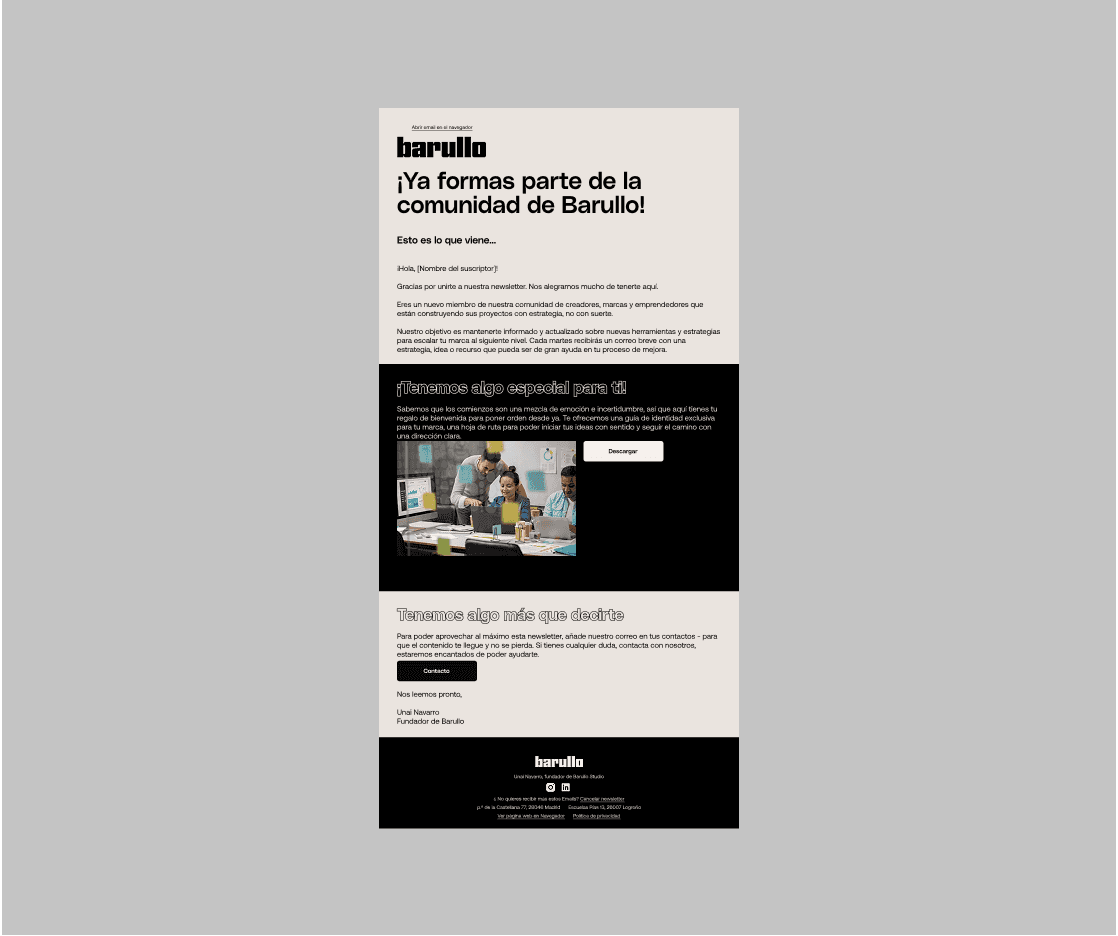 Brand consistency and coherence were considered at every stage across the website and landing pages. The same clear and bold character was also maintained in the newsletter. Ensuring consistent communication, both in terms of user experience and visual language, was essential for users to truly feel what defines Barullo.